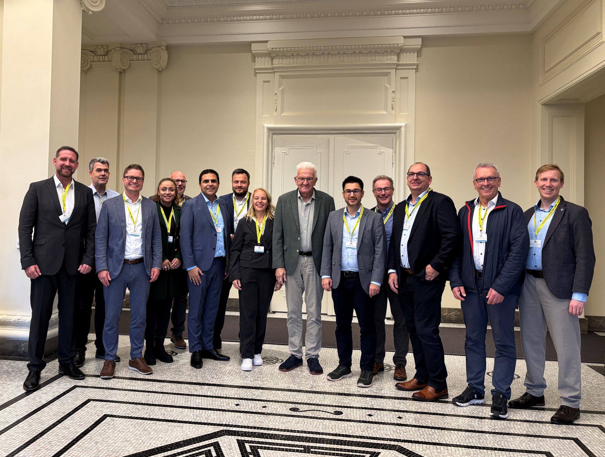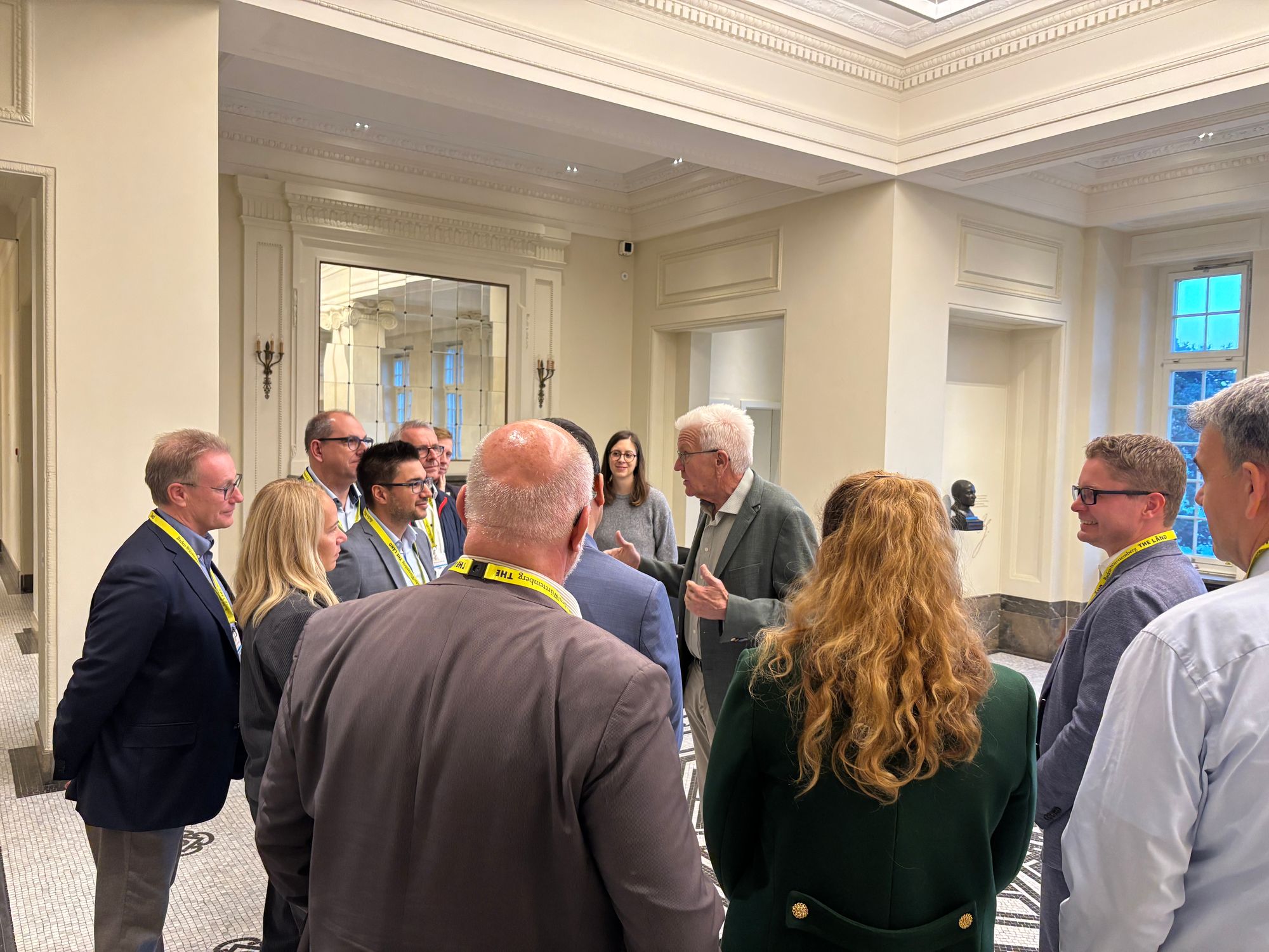 Im Anschluss an den bildungspolitischen Austausch ging es für die Bürgermeisterinnen und Bürgermeister weiter zur Villa Reitzenstein, dem Sitz des Staatsministeriums. Dort erhielten die Teilnehmenden spannende Einblicke in die Geschichte und die heutige Arbeit des Hauses. Als besonderes Highlight begrüßte Ministerpräsident Winfried Kretschmann höchstpersönlich die Gäste und nahm sich Zeit für ein kurzes Gespräch.